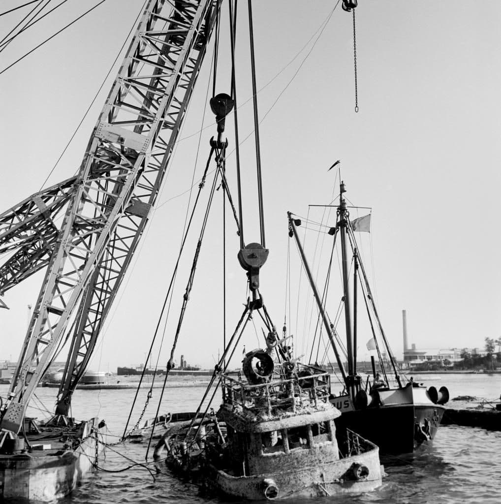 Suez Canal by Port Said, Egypt. A ship is lifted from the canal a few months after the Suez Crisis. January 1957.