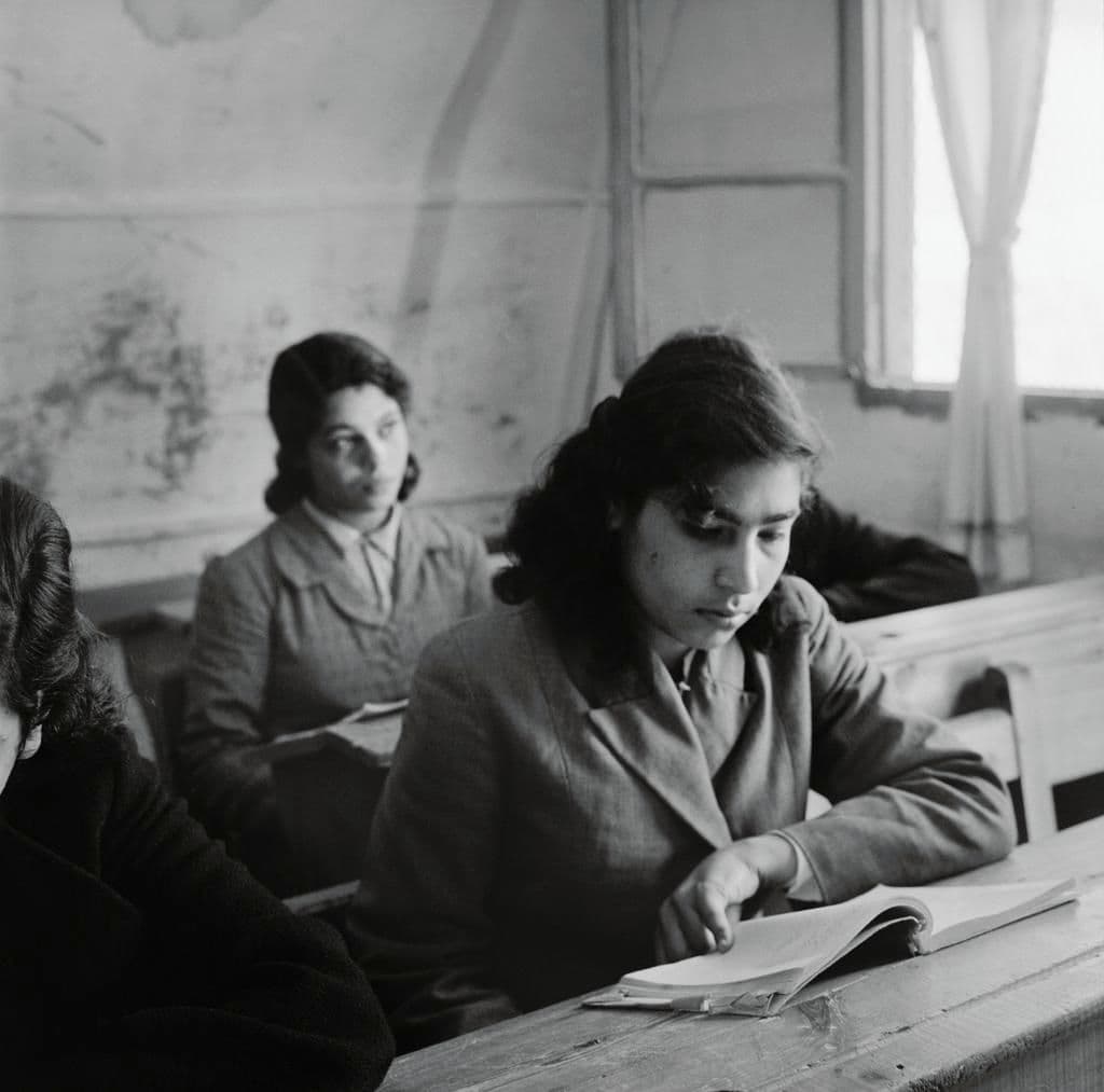 Two girls in a classroom as part of UNRWA’s educational program. Gaza Strip, May 1957.
